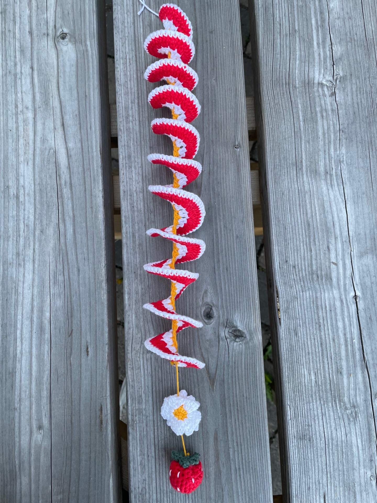 Vindsnurra med en jordgubbe och en jordgubbsblomma. Virkas i rött, gult, vitt och grönt bomullsgarn.Jordgubben är fylld med vadd och en tyngd för att få vindsnurran att snurra fint.